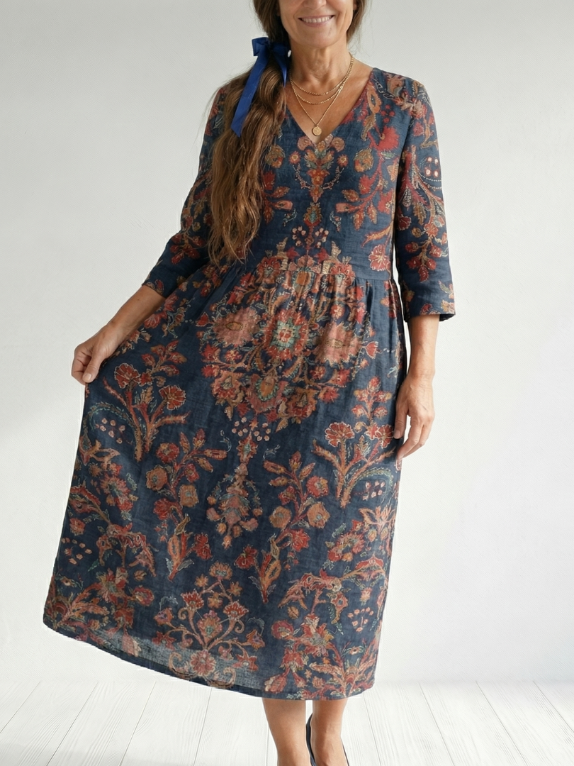 This dress features a square neckline with soft flutter sleeves and a full-length silhouette in a delicate floral print. The fabric is lightweight with a gentle drape, offering ease and comfort through the day. It fits close through the bodice and flows naturally from the waist for everyday wear or small gatherings.